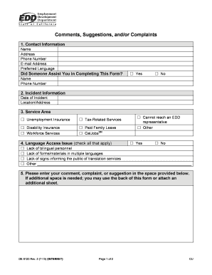Filling out the De8123 form is a straightforward process that allows users to submit comments, suggestions, or complaints to the Employment Development Department. This guide will walk you through each step to complete the form accurately and efficiently online.