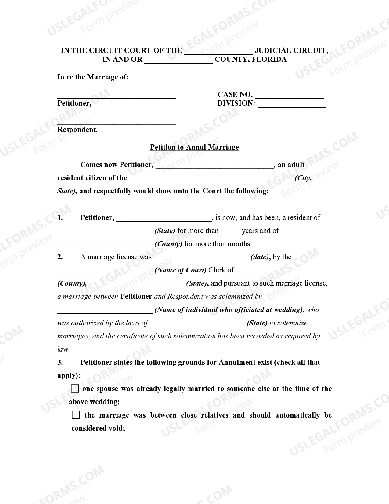 In Florida, annulment documents help individuals declare a marriage null. Our attorney-drafted templates are quick and easy to complete.