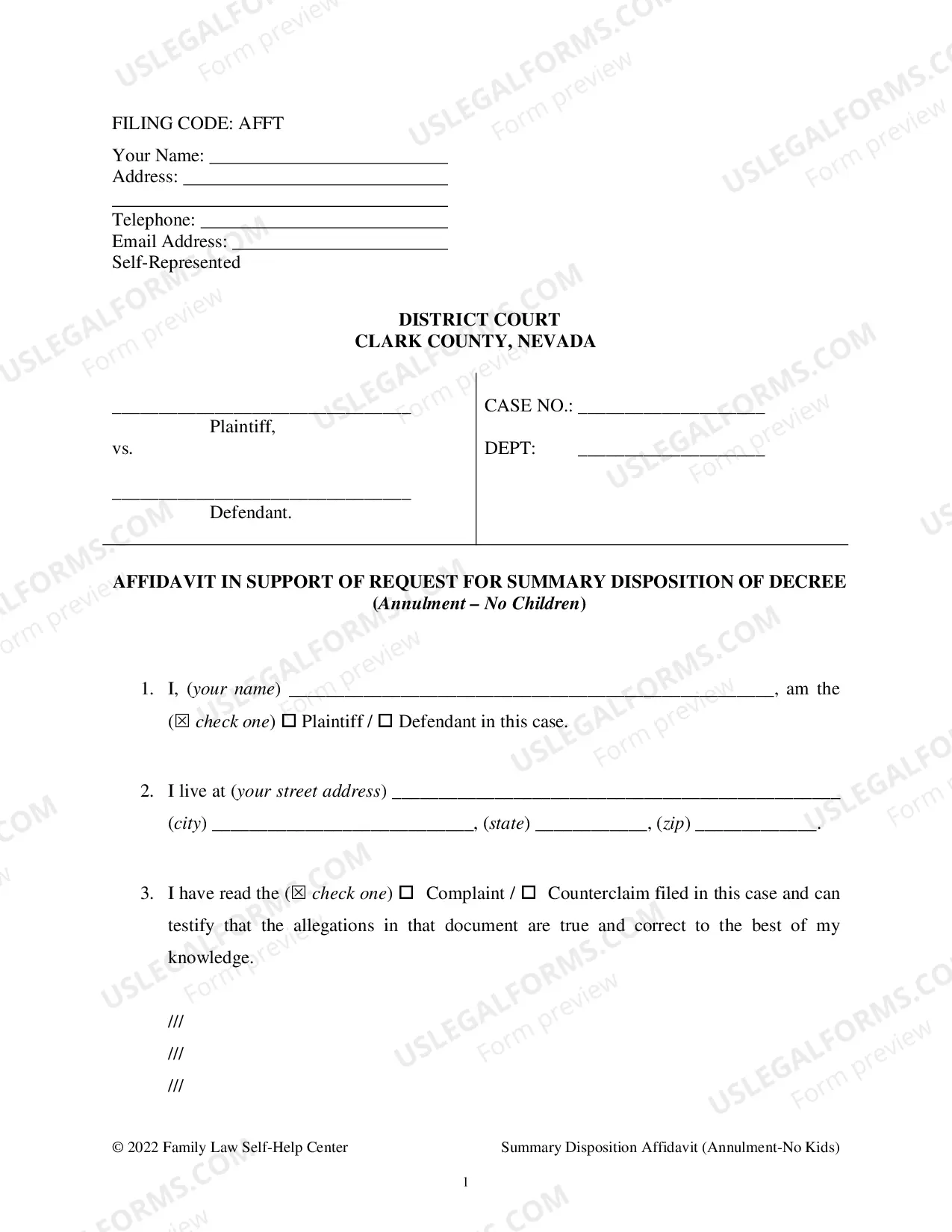 Request a final annulment with this affidavit, designed specifically for couples without children.