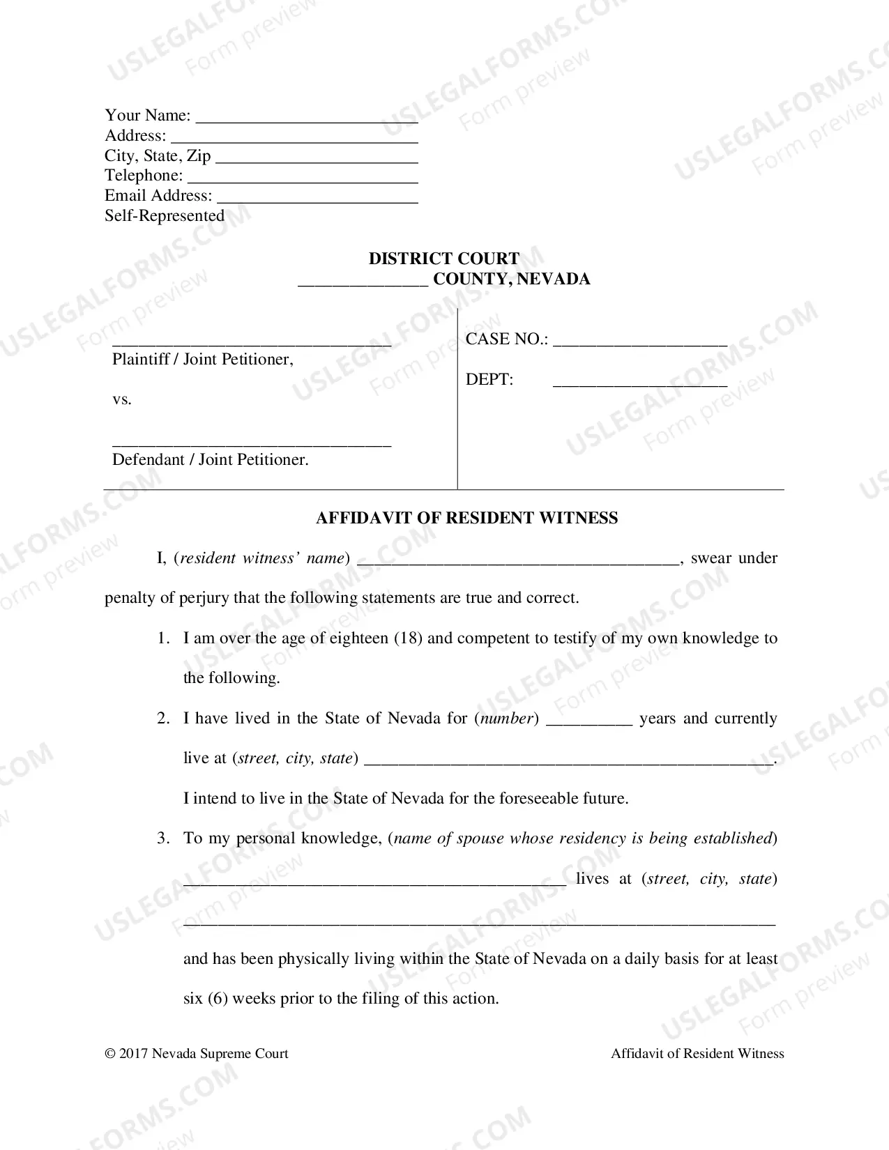 Use this legal document to confirm someone’s residency in Nevada during annulment proceedings.