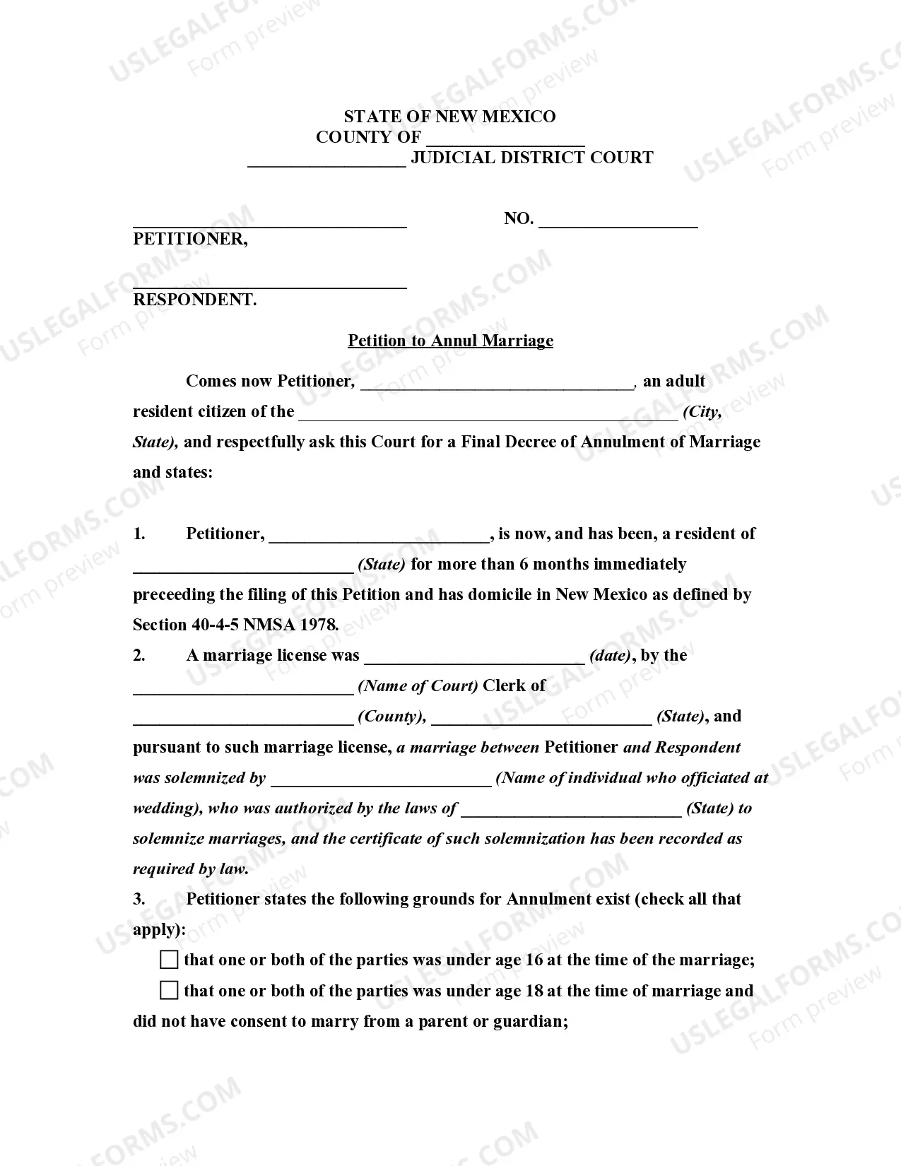 Use this form to legally declare a marriage null and void due to specific circumstances like age or existing relationships.