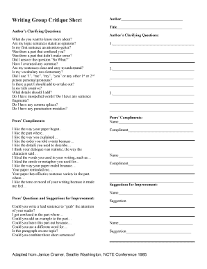 The Writing Group Critique Sheet is a valuable tool for obtaining feedback on your writing. This guide will walk you through the steps to fill out the form online effectively, ensuring you capture all relevant information for constructive critiques.