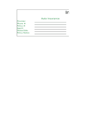 - Begin with the auto insurance section. Fill in the name of your auto insurance provider, their phone number, your policy number, the name of your agent, your deductible amount, and any relevant policy notes regarding your coverage.