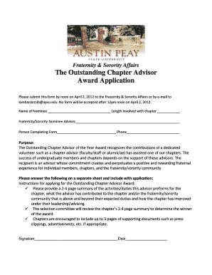 The Outstanding Chapter Advisor Award Application is designed to recognize the invaluable contributions of dedicated chapter advisors in fraternity and sorority communities. This guide will help you navigate the online application process effectively and ensure you provide all necessary information.
