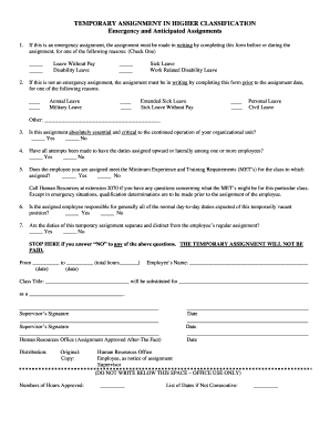 - Indicate whether this assignment is an emergency by selecting the appropriate checkbox before listing out the reason for the assignment. Choose from the provided options such as 'Leave Without Pay', 'Sick Leave', or any other applicable categories.